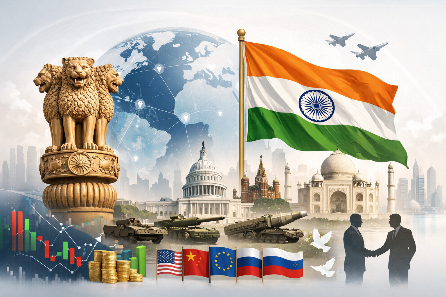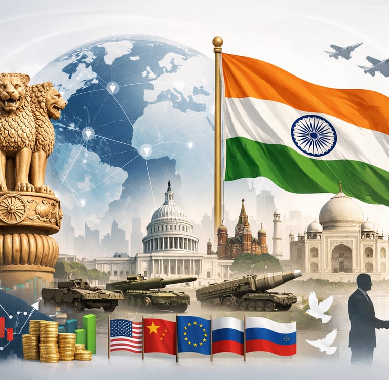 Modern India practices multi-alignment — engaging simultaneously with diverse and often rival powers. Cooperation with the United States in defense technology and innovation exists alongside continued defense and energy engagement with Russia, while maintaining diplomatic outreach across Asia, Africa, and the Middle East.
